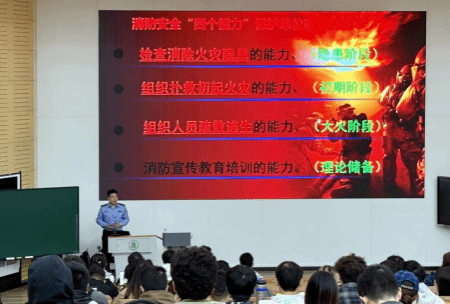 讲座开始前,吴飞越教官播放了消防宣传视频。随后,他从消防安全“四个能力”分别进行了宣传及培训,包括检查消除火灾隐患、组织扑救初起火灾、组织人员疏散逃生、消防宣传教育培训四个不同阶段的能力。吴飞越以典型火灾案例为基础,通过触目惊心的事故现场照片与视频、详尽的数据,深刻剖析了电动车违规进楼充电、老旧插排超功率等多个火灾案例发生的原因及危害,使同学们直观地了解到火灾发生的突发性与破坏性。“除了火灾的扑救,检查与消除潜在的火灾风险尤为重要。”吴飞越结合香蕉视频