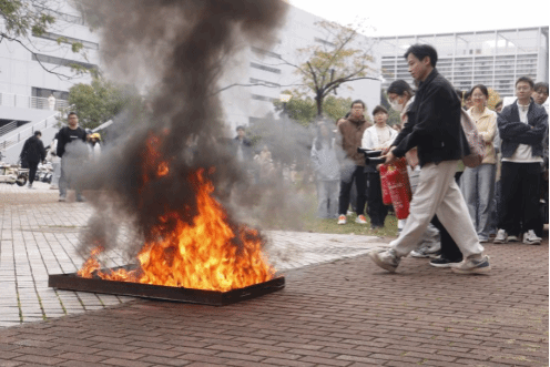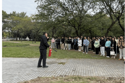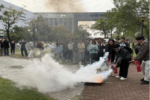 楼A座门前广场进行消防实操培训。在模拟火灾现场,教官手持灭火器实物,拆解演示了 “提、拔、握、压”四字操作口诀,强调 “瞄准火源根部喷射”的核心要领,并提醒大家注意站在上风方向、保持安全距离等操作规范。随后,同学们分组轮流实操,在专业指导下亲身体验灭火器使用流程。从提起灭火器、拔掉保险销到对准模拟火源按压喷射,整个操作过程有条不紊,大家认真体会每一个动作要领,直至成功扑灭明火。现场安全员全程监护,确保实操培训安全有序进行。