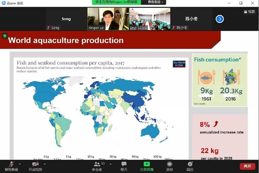 品总产量及彩虹虹鳟的产量逐年递增的良好态势下,饲料原料面临着资源紧缺,价格昂贵等问题,微藻能否替代合成虾青素和鱼油作为饲料原料值得探究,随后由Shanli Zhu博士和Kun Wu博士就添加微藻DHA和虾青素对幼年虹鳟生长性能、糖脂代谢、氧化还原状态及相关基因的影响等研究进行介绍,对未来探究最佳替代比从而改良饲料原料添加成分及配比提供良好基础。