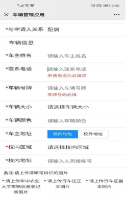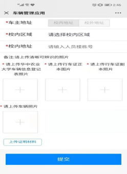 车辆信息登记表”(见附件)“行车证正本”“行车证副本”“车辆照片”,教职工、学生办理车辆上传以上材料即可。