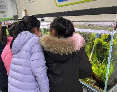 学生的获奖作品。见到真正的水族缸,同学们立刻围了过去,眼睛紧紧地盯着这些美妙的作品,发出阵阵惊叹声。只见一个个水族缸中,翠绿的水草随着水流轻轻摆动,宛如一群绿衣仙子在翩翩起舞。缸底铺满了陶粒,五彩斑斓的小鱼穿梭其中,时而躲进水草的怀抱,时而探出脑袋好奇地张望着外面的世界。随后的分享环节,同学们纷纷发表着自己的看法,“我喜欢2号缸,因为这个水族缸有很多漂亮的红绿灯鱼,还有很多水草,像一个梦幻的海底花园!”“我喜欢6号缸,因为它造型很别致,有个拱形的洞,小鱼可以在里面游来游去,和水草在一起,感觉很和谐。” “我喜欢3号缸,因为里面有鱼,有螺,还有各种各样的水草,颜色特别漂亮”!