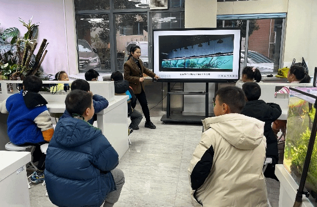 课程伊始,黎洁老师用近几年世界水草造景大赛的获奖作品以及生活场景中的大型水族缸作品将小朋友们带入了美轮美奂的水族世界。通过设问和互动引出水族缸的生物和设备组成,并逐一讲解水草、水生动物、微生物在水族缸的作用,进而引出水族缸水生态系统的概念。在这个系统里,水草通过光合作用制造氧气和食物,是主要的生产者;鱼类和螺、虾等水生动物吃水草(藻类)或小鱼小虾,是水族缸里的消费者;微生物分解有机物质,保持水质清洁,扮演着分解者的角色。当然,石头、木头等搭建的硬景观、水草泥、过滤系统和照明装置都在这个小生态系统中发挥了非常重要的作用。