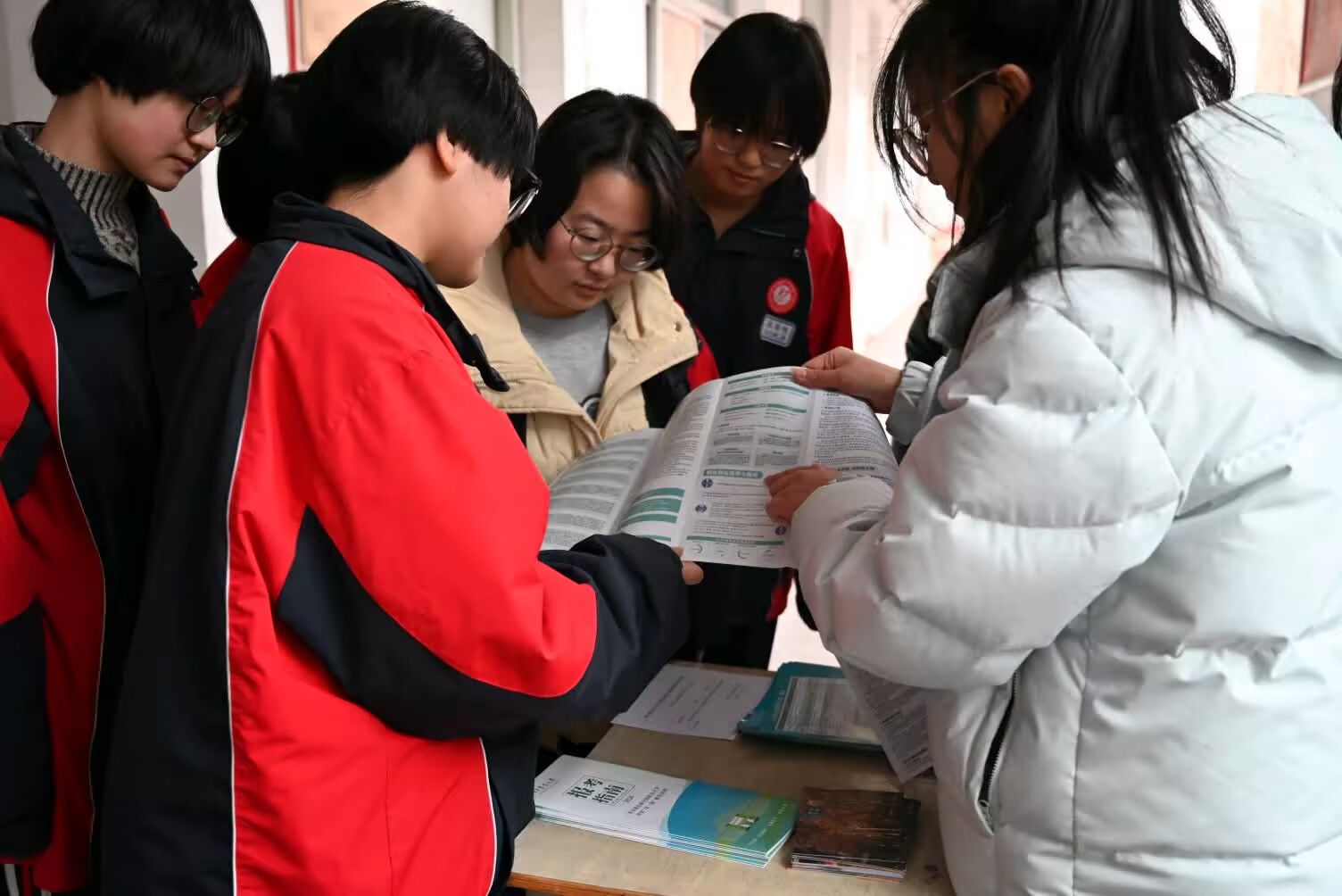 队员周佳丽则分发着招生手册和文创纪念品,与学生们亲切互动。当学生们拿到这些精心准备的资料时,眼中闪烁着好奇与向往的光芒。