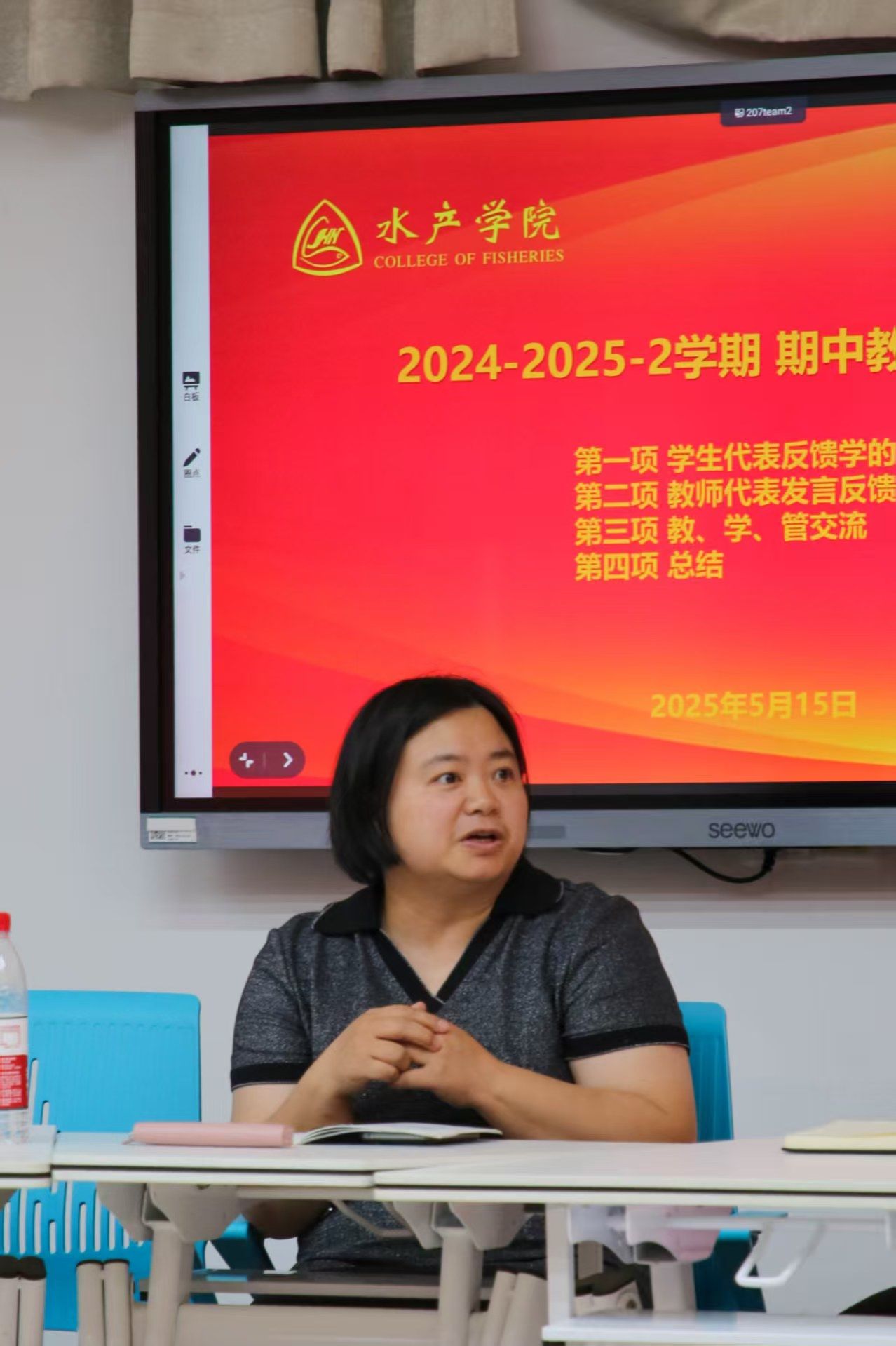 于第四教学楼C207召开2024-2025学年第二学期期中教学检查师生座谈会。实践教学管理处处长刘震、思想政治教育管理处梁平军、本科生院运行科向佳玲、基层教学组织负责人及各年级师生代表出席了会议。会议由香蕉视频