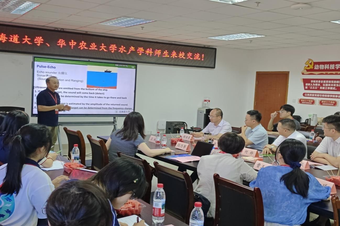 与北海道大学师生代表团前往鄂州海大种业科技公司进行调研。张曦老师对该公司养殖规模与养殖品种做了介绍。