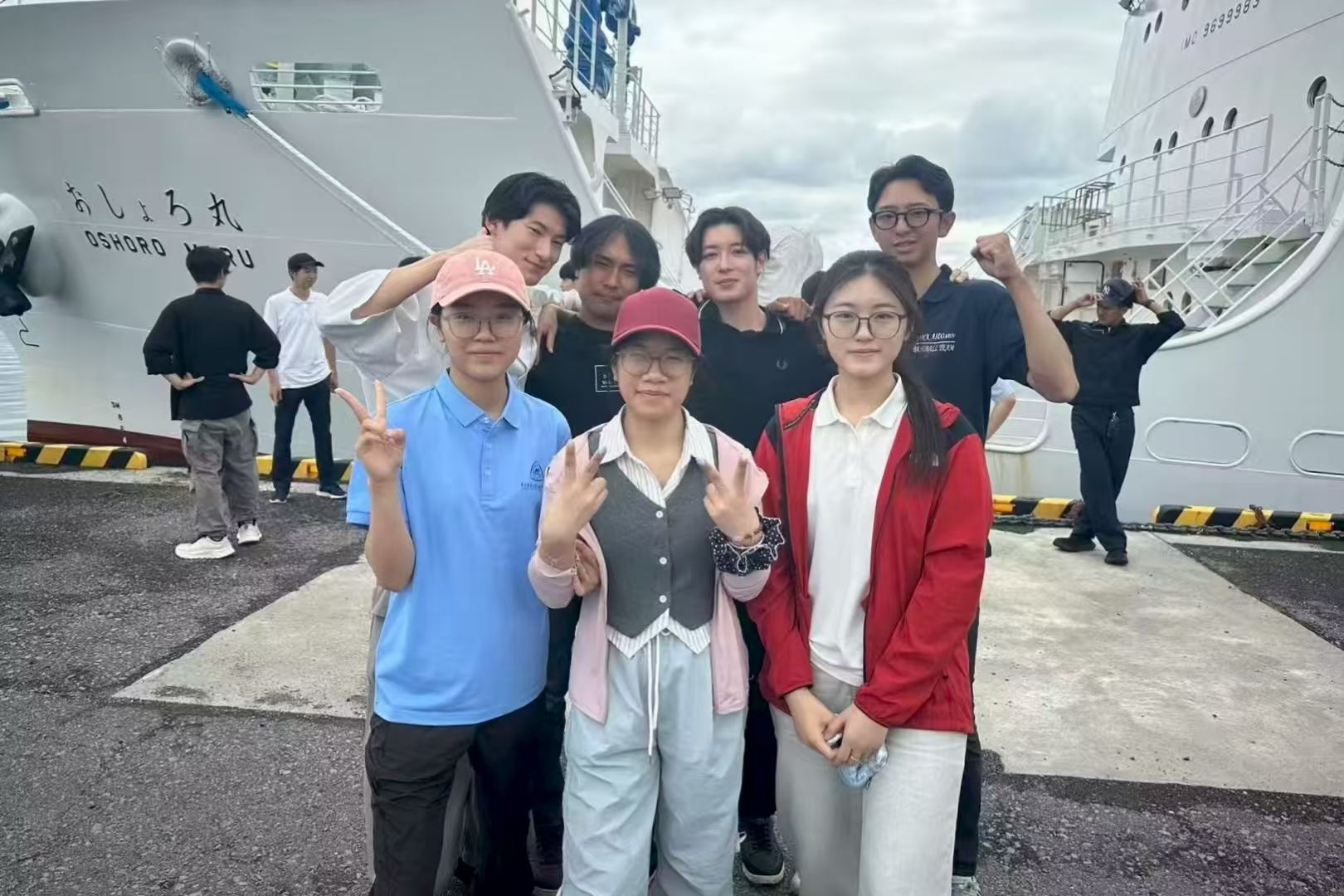 访学第五天,二组成员与来自北海道大学的学生登上了“おしゅう丸”,开展渔业资源调查实习。在海洋科考环节,访学团第一次近距离接触到了CTD检测仪。夜幕降临,同学们体验了海钓。船员将钓上来的鱿鱼做成刺身,清甜鲜嫩的味蕾盛宴是大海的馈赠。