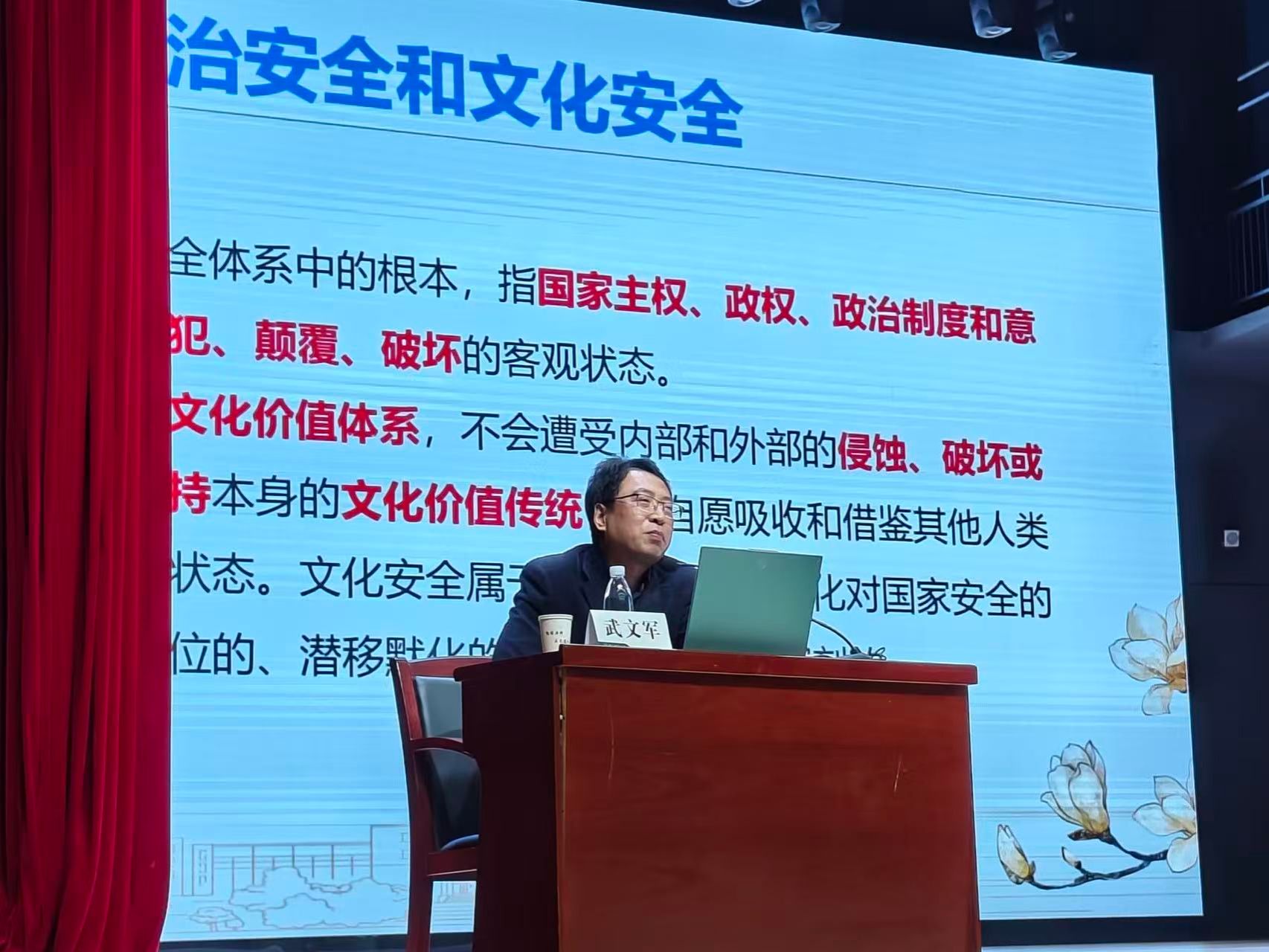 副教授武文军老师作专题报告,对新华社发布的《思想殖民——美国认知战的手段、根源及国际危害》报告进行深入解读,并结合现实案例分析国家政治与文化安全的重要意义。
