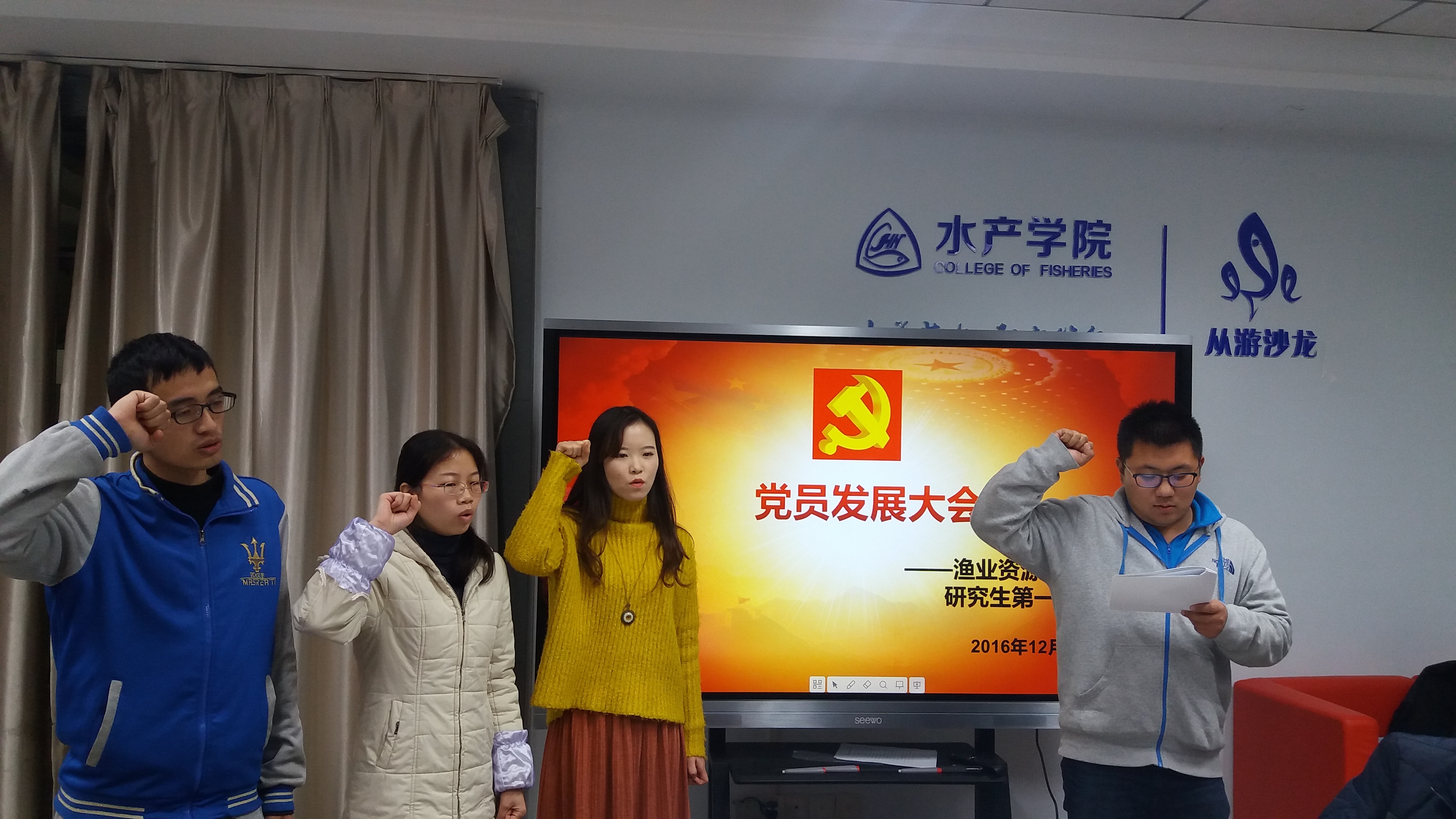 内容提要:12月11日晚,渔业资源与环境研究生第一党支部召开支部大会,对徐青龙同志转为中共正式党员,李可、夏润红、刘琪三位同志发展为中共预备党员做出了充分讨论。最终支部大会通过决议,同意徐青龙同志转为中共正式党员,同意李可、夏润红、刘琪三位同志发展为中共预备党员。