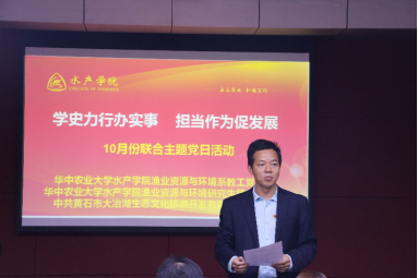 致欢迎辞,对百忙之中参加会议的各位同志表示欢迎,并着重介绍了渔业资源与环境系师生长期在大冶湖开展的社会服务工作,提出党建工作要落实在工作、研究以及育人之中,以社会服务的形式促进行业的发展,实现党建业务的双丰收。渔业资源与环境系教工党支部副书记汤蓉同志带领大家重温入党誓词,黄石大冶湖文旅公司党支部委员领学党章部分章节内容,明确如何做一名合格党员。