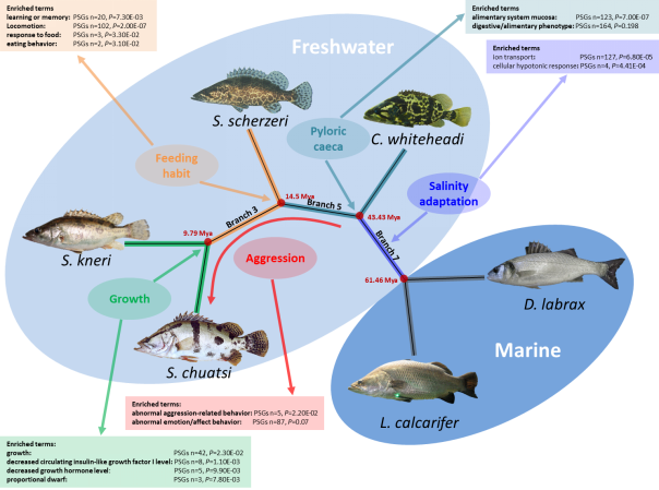 鳜科(Sinipercidae)鱼类生性凶猛,自开食起即以其他鱼类为食,通常拒食浮游动物或人工饲料。适口活饵料鱼的稳定供应成为鳜鱼产业发展的关键制约因素,用人工饲料替代活鱼养鳜是产业健康可持续发展的必然选择。梁旭方教授课题组主导并与德国莱布尼茨淡水生态与内陆渔业研究所(IGB)合作完成了翘嘴鳜(Siniperca chuatsi)基因组的三代测序及染色体水平组装,以及大眼鳜(Siniperca kneri)、斑鳜(Siniperca scherzeri)和少鳞鳜(Coreoperca whiteheadi)高质量基因组组装。通过比较基因组学分析揭示了鳜科鱼类在凶猛食性、生长、幽门盲囊和盐度适应等性状上的快速适应性进化机制。