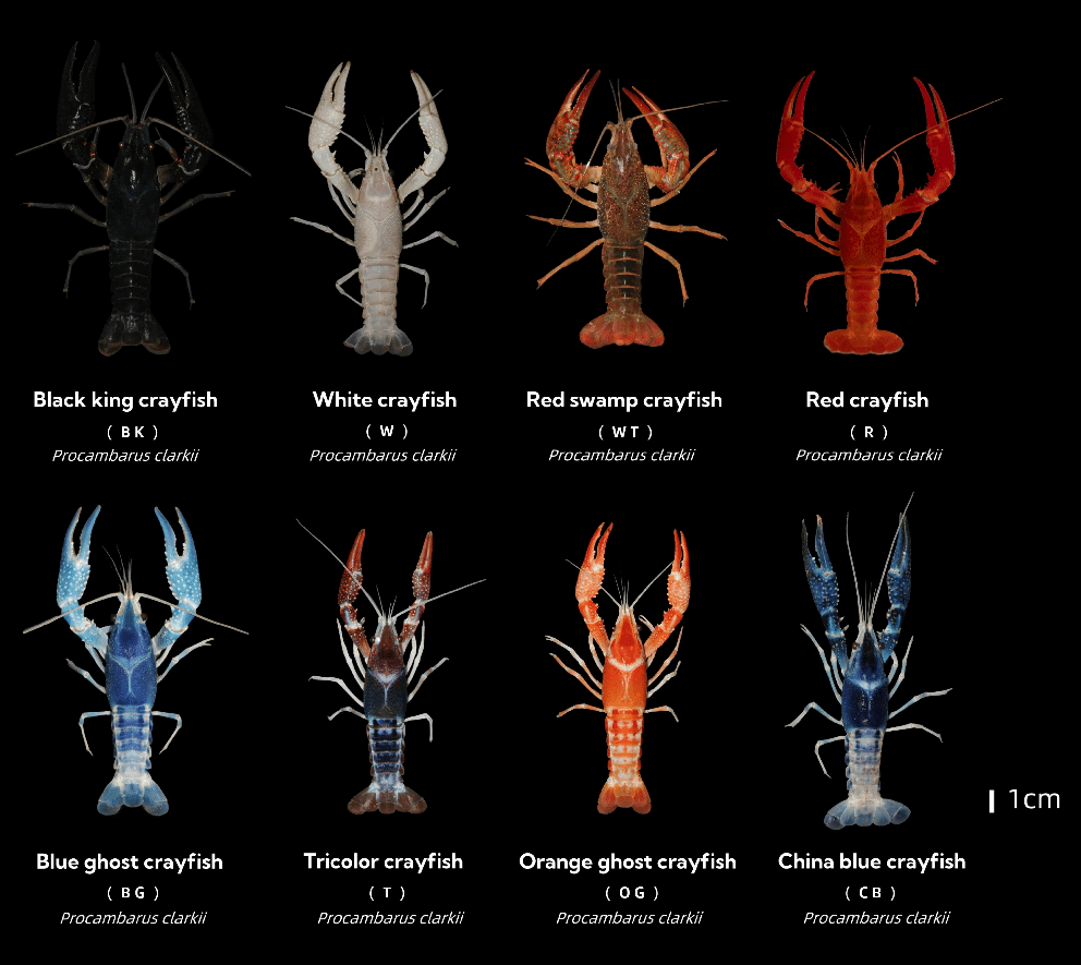 经济物种之一。近年来,在双水双绿稻虾综合种养模式加持下,小龙虾年产量跃升至我国虾类之首。目前,种质单一是制约我国小龙虾品种改良的瓶颈。为此,该团队从多个地域采集了野生型(野生和养殖群体)与7种不同体色变异的小龙虾种质群体(图1),通过基因组测序与遗传分析首次揭示:小龙虾野生型群体与上述7种体色种质群体存在显著的遗传分化;其中,体色全黑种质——黑魂螯虾(Black King Crayfish)的基因组序列与野生型的差异最大(遗传距离最远);此外,黑魂螯虾表现出“螯小且温顺”的表型与行为特征,具有较大的育种应用潜力。