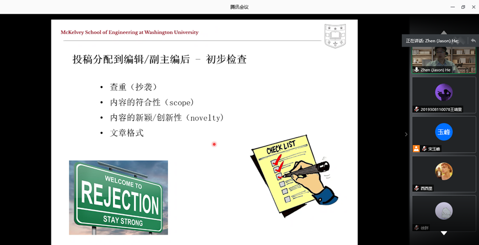讲坛学术活动通过腾讯会议在线上举行,美国圣路易斯华盛顿大学的贺震教授作题为“如何发表高水平科研论文”的报告。贺震教授目前担任多个期刊的主编、共同主编,拥有丰富的审稿经验,了解审稿的流程。本次报告面向全院师生,由香蕉视频