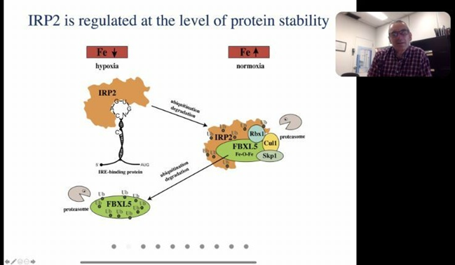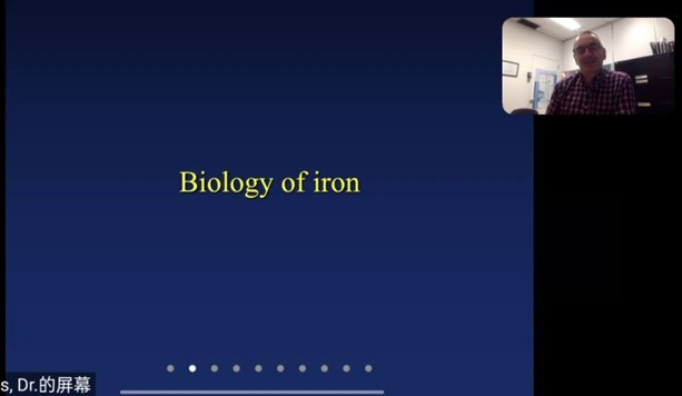 讲坛进行了精彩的线上报告,报告内容主要包括铁的生物学特征、个体和细胞水平的铁稳态和代谢调控、IRE/IRP调节系统、铁调节蛋白和铁代谢的病理生理学等,报告时长超过2个小时。