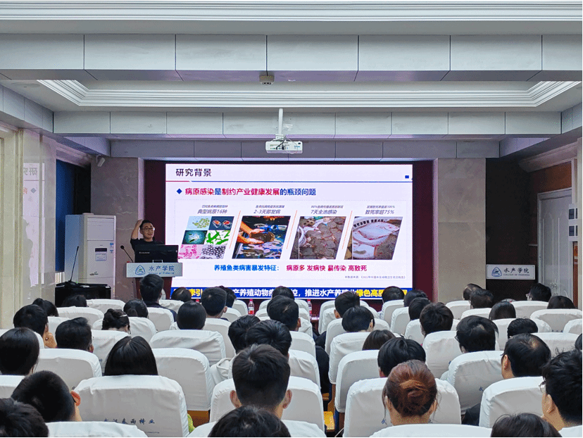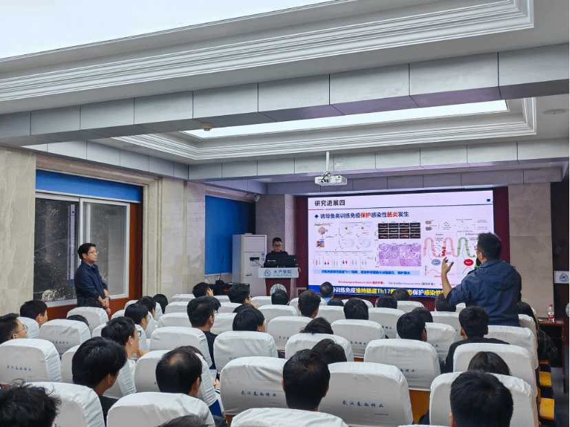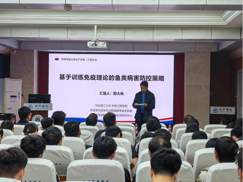 楼天辰报告厅A105举行,特邀华东理工大学阳大海教授作了题为“基于训练免疫理论的鱼类病害防控策略”的分享。
